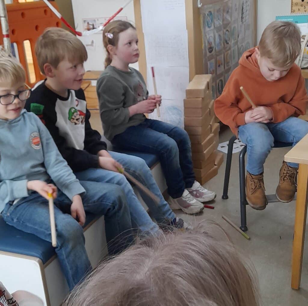Deze keer was het domein: ‘Spelen met instrumenten’ aan de beurt. Beide groepen zijn bezig geweest met ritme aanvoelen met de instrumenten. Met stokjes, triangels en trommels.